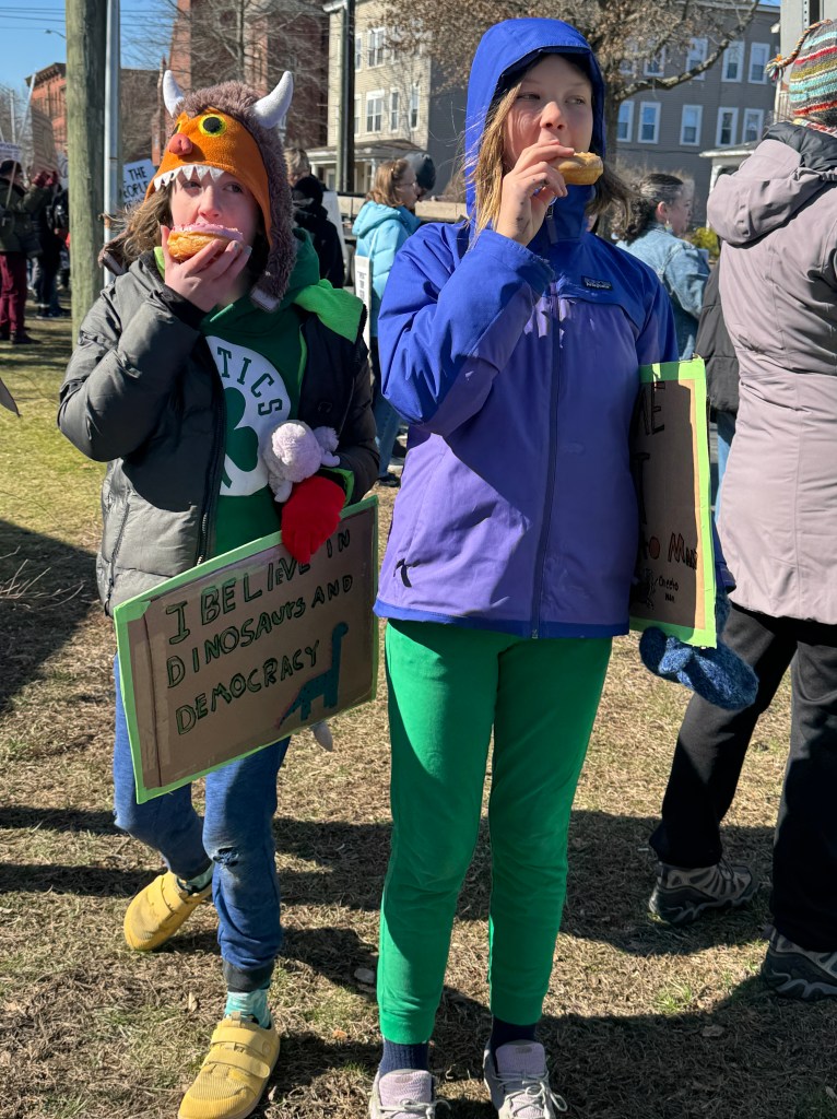 We left for the early protest in Easthampton where a few hundred gathered on a round-about near Sita’s house. There were speeches and songs and a box full of donuts which the kids discovered quite quickly, as if they could smell them. The average age must have been in the 60s or 70s. I didn’t see any teenagers and our grandson, who showed little enthusiasm for the whole thing, conveniently forgot his sign (a crown crossed out with the words No Kings) and probably only stayed because of the donuts.