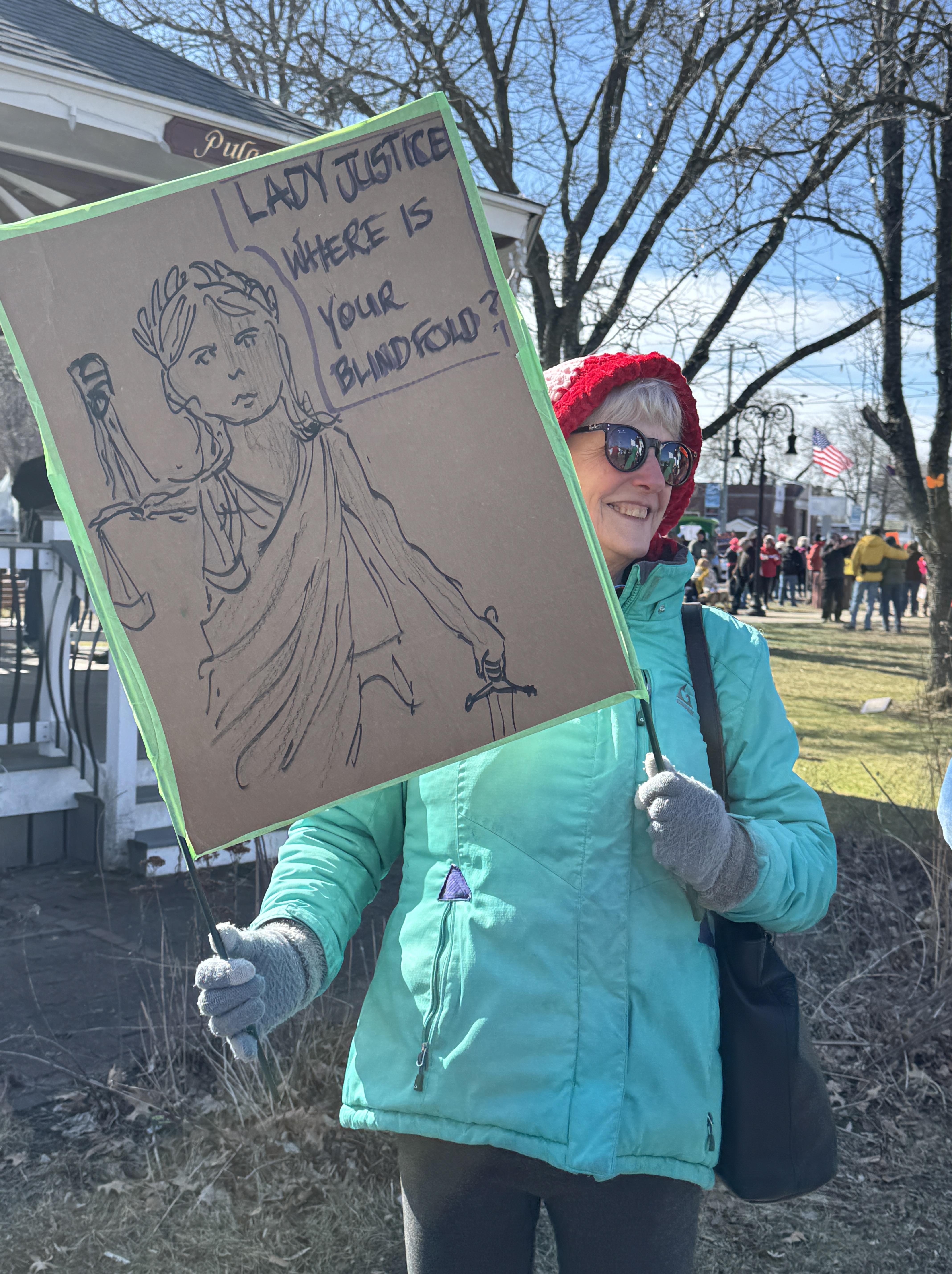 I made my signs the night before in Sita’s studio. It is a paradise for sign makers as it has everything one could possible need for sign making. I had wanted to make a sign depicting Lady Justice without a blindfold. Thanks to my sketching class I was able to do that without having to trace her from an image on the internet.