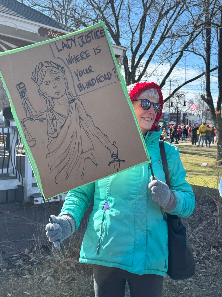 Yesterday we were out on the streets, first in Easthampton and then in Northampton, protesting the Trump kleptocracy. The vibe was wonderful. There was so much creativity, in signs, in songs, in chants, in outfits. Many had American flags which was a problem for the lonely Trump supporter who could no longer lay claim to the American flag and was not really easy to distinguish from the other flag wavers. He did have a Trump hat and he could pretend that all the honks and thumbs-up signs were for him, supporting his president. Like so many others who still support the president, he lives in an alternative reality. Apparently the man is out waving the flag for his president not just on No Kings Day but every day (which is, I suppose, Kings Day for him).