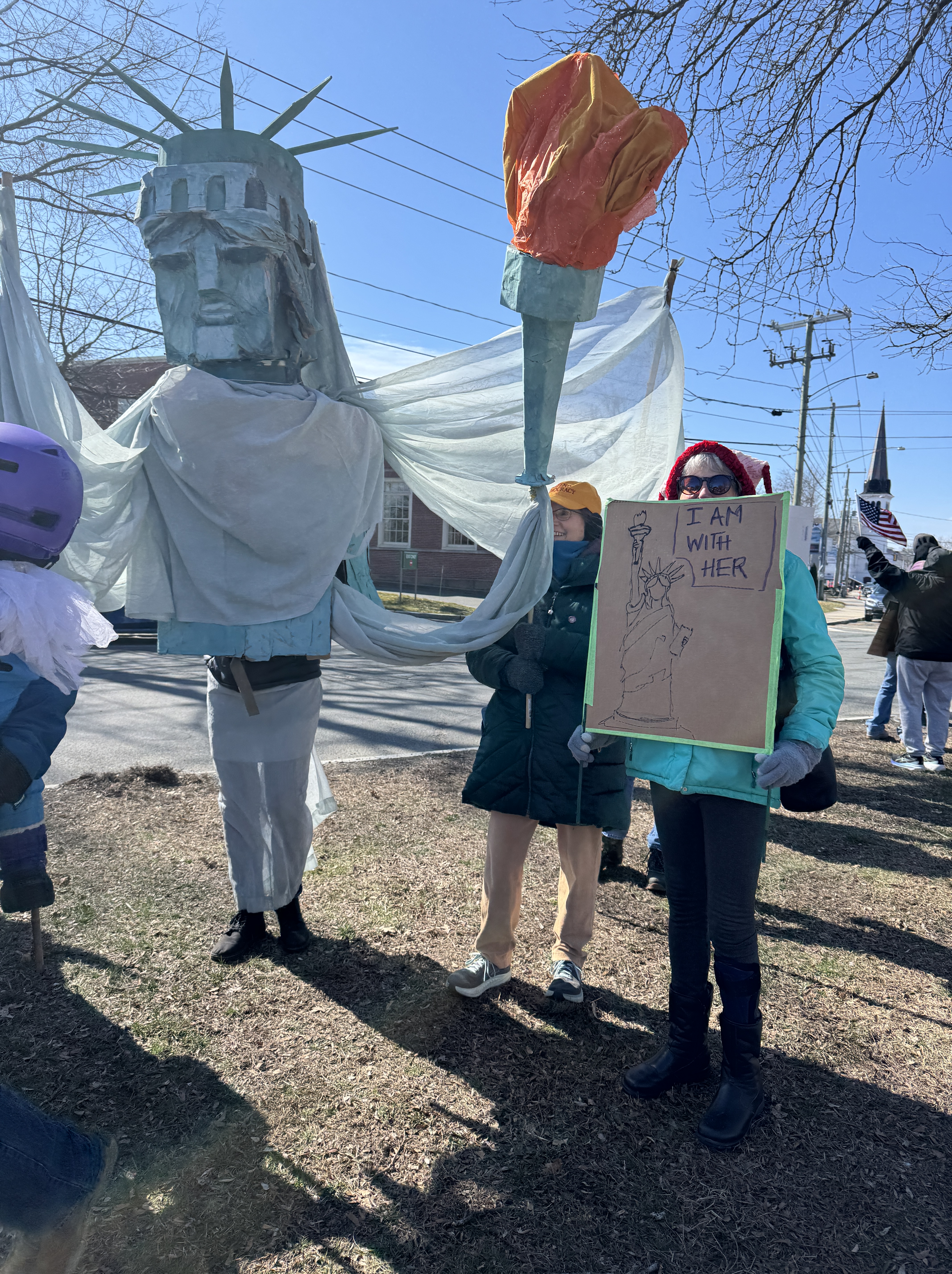 I had also liked a sign I saw in the past of the statue of liberty with the words “I am with her,” and put that on the other side of the plain brown cardboard. At the Easthampton protest there was a large puppet of lady liberty. I posted with her with my sign.