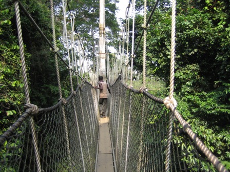 After lunch at the restored Bridge House, now a hotel and restaurant, we left for Kakum National Park. The park is about 35 kilometers inland, and has the only canopy walk in Africa, according to our forest ranger guide. We started our walk with buses full of Ghanaian adolescents, mostly church groups, and a sprinkling of foreigners. The walk up was tricky for me, uneven rocks and quite steep at first. But even I was in better shape than many of the young Ghanaians, so I understand the health minister’s preoccupation with ‘Mens Sana in Corpore Sana.’ Cabul and I were number 2 and 3 on the walk which consisted of 7 spans of 40 to 60 meters long that were constructed from aluminum ladders laying flat on the bottom of nets tied to ropes and with a plank over the ladder to facilitate the walking.