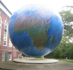 A picture on one of the marker at the base of the globe shows long rows of people sitting at high desks doing this painstaking work. From a balcony above, at the time, you could see the same as an astronaut would see at 700 miles above the earth. Remember, this was 1926. The rocket’s eye view allowed people to understand how geography shaped transportation routes and the growth of cities and regions. The map became an important tool for primary school teachers who took their classes to see it. Currently the map is in pieces in a basement of Babson and no longer visible to the public. The giant globe is not quite as useful because you can’t see the whole landscape; it is also disappointing because it no longer rotates as it used to in the 50s when it was considered a ‘tourist attraction and media wonder.’ Now it just hangs there with Africa always looking the same way. I also has become rather shabby; the North Pole is covered with tree pollen and bird poop. The only educational thing about it now is that is shows abundantly clear how the earth needs to be kept clean or else. Other than that it is an eye sore.