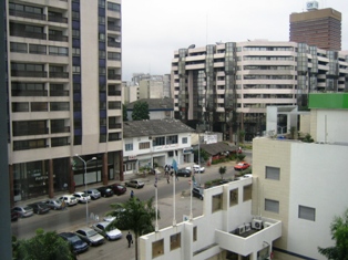 Downtown was empty, at 7 PM, which is unusual for an African city. Large concrete barrages, no longer in use, were shoved to the side around some of the banks. According to Alphonse everything is being rebuilt and repaired and things have been calm for a long time. It looked that way. In daylight there are few signs of the destruction, which acoording to Alphonse wasn’t so bad here on the Plateau part of Abidjan. ‘Wait until you see the destruction in the countryside,’ he added. This is what I see from my windows. The view is that of a hundred other African downtowns.