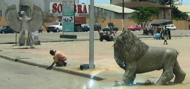 On our way out of town we passed by a roundabout that I had noticed earlier because of the two huge cement statues of an eagle and a lion. They stand by the side of the road, rather forlorn, as if waiting to be put in a more fitting place, or returned to where they were taken from. The lion needs some repairs as its head has been cut off. The eagle is intact and spreading its wings as if to fly away. I asked Alphonse how come the lion was damaged and the eagle was not? He did not know.