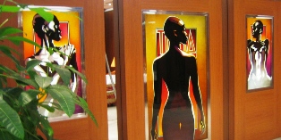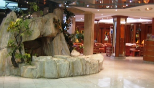 The king sits with his back to a large waterfall sculpted out of cement, plastic vines and leaves that blocks the lobby off from the street and fills one side of it. On the left of the entrance all the chairs are bunched together to make room for the ceiling painter. This made it a little harder to get a good view of the wall decorations, pictures of shiny and slippery beauties that, I presume, are intended to lighten up the experience of meeting with a business partner in a hotel lobby.