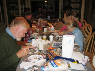 Dinner was a wonderful noisy affair with 19 people and a baby, sitting around two tables shoved together. After dinner we brought out the art supplies, part of the very loosely designed program, and musical instruments, to accompany the creative extravaganza