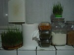 Our cook has started the preparations for a traditional new year’s treat (NaoRoz is on March 21); it is made of wheat grass. In the bottom of a cookie tin and a small plastic container wheat grains have been kept wet and grew into 6 inch tall grasses. They will be cooked, mixed with sugar (according to some, not to others) and then compressed into candies if I understand his Dari well. I missed a few words. I am very curious.