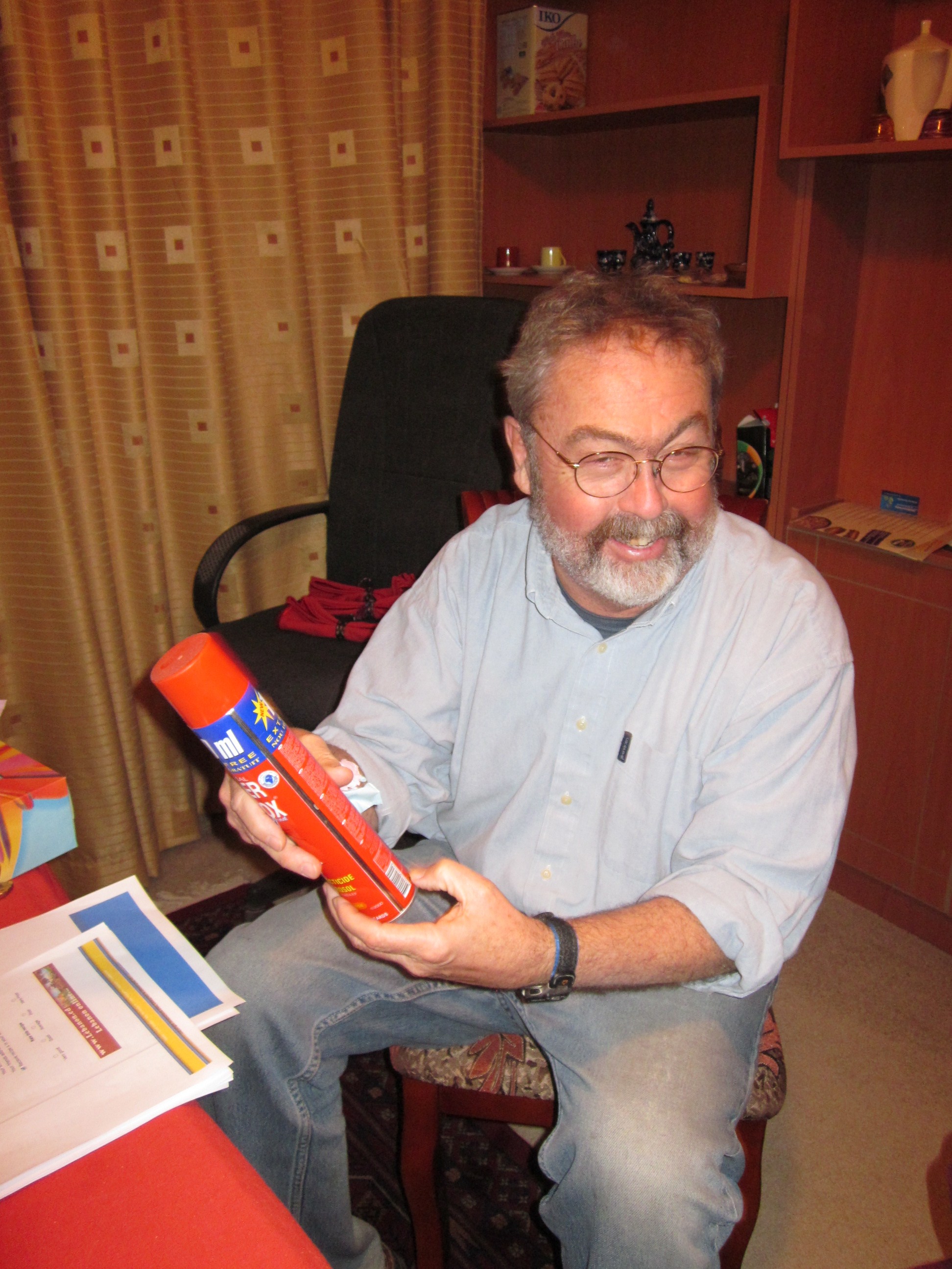 We discovered (from purchase requests) that our household staff uses 6 cans of Russian insecticide spray per month. The cook sprays the kitchen more than is good for us as well as unnecessary (there are few bugs in this high and dry climate). The instructions on the can are indecipherable (Russian and very small English print), besides, the cook cannot read English (or Russian for that matter). Axel explained that the spray does not only kill the bugs that are portrayed in small circles with an X drawn through them but is also bad for humans. Ankie proposed to take a picture of the cook himself and paste it below the bugs with an X through it as well.