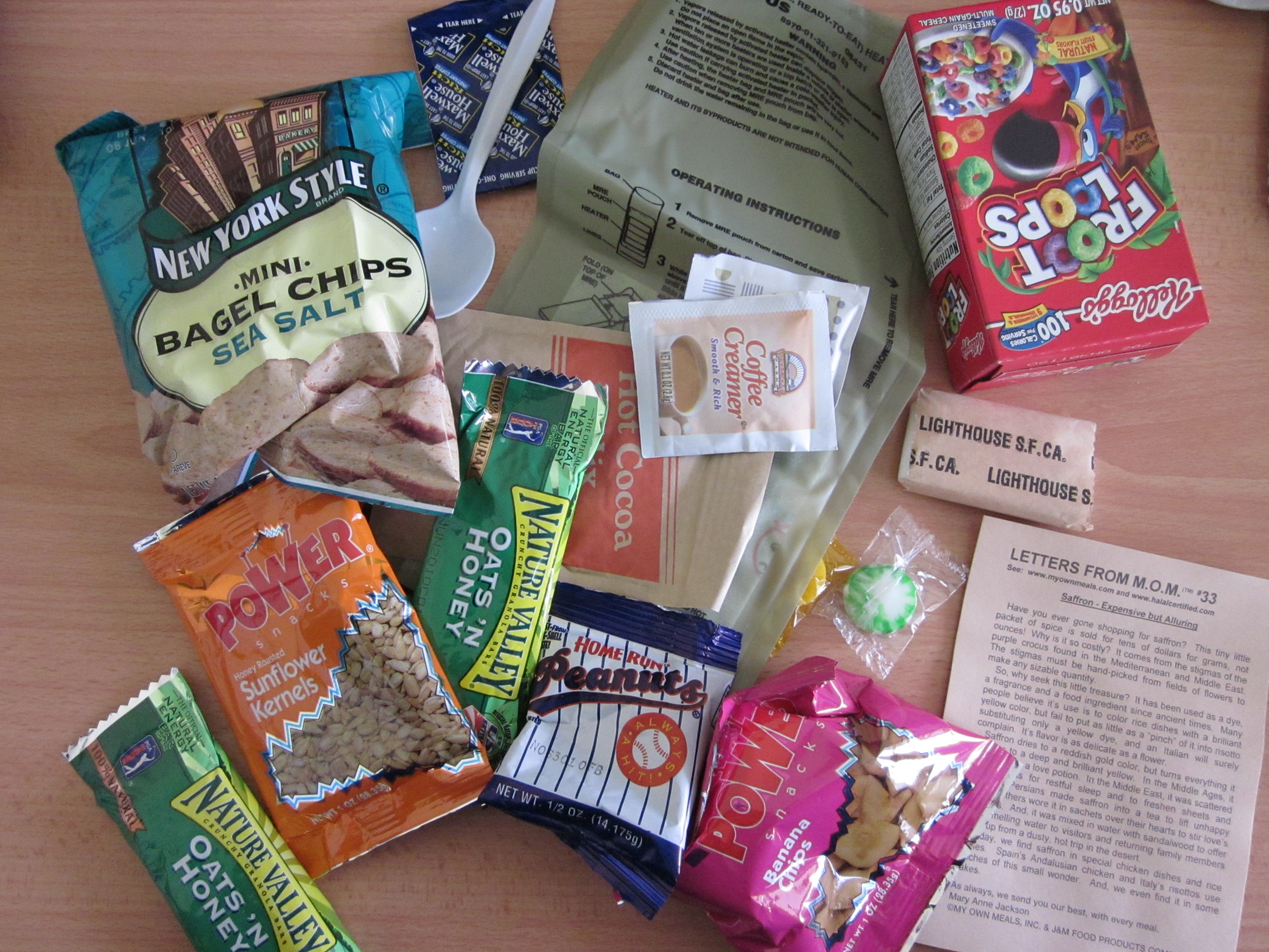 There was a Nature Valley bar, a bag of Power banana chips, a small pack of sunflower seeds, New York bagel chips, cocoa powder ready to mix, one serving of Maxwell instant coffee, domino sugar, pepper and salt (for what?), a plastic sleeve with a heating element, presumably to heat water for my cocoa or coffee, Red Sox label peanuts and a letter from M.O.M (My Own Meals, the company that packages these) about saffron, including a website in case I want to learn more about saffron.