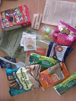One of my colleague who manages to live on MREs (Meals-Ready-to-Eat, military fare that has fallen of the truck) had promised me a snack pack for taking notes at a meeting yesterday. This morning he delivered the promised snack pack. It included 2 hard candies, a one serving box of Fruit Loops (but what about the milk? Was I supposed to mix the coffee creamer with water and pour it into the box that had scored lines to turn it into a bowl?).