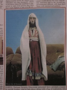 Yesterday’s newspaper showed a picture of a would-be suicide bomber, ‘clad in lady-dress’ according to the caption, who was caught on his way to Kapisa with a bag full of explosives. The picture shows what looks like a mentally disabled man, his capture, despite his ‘lady dress’ suggesting this may well have been the case. If not his behavior, then his beard and shoes would have given him away. Young girls have also been girded with suicide vests – people go to great length to pursue all sorts of sinister objectives. The picture filled me with sadness.