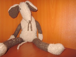 I finished number two of my projects today. The knitted mouse has been assembled and came out fairly well, although not by long stretch resembling the picture in the knitting book. I filled the body, head, arms and legs with Afghan kapok, final leftovers from the many pillows I have made. The cotton, fluffy now, will of course flatten over the years. Since that is all I had available to me (rather than the Pakta kharidji, the foreign artificial kapok) I am not taking the long view on this project but rather one of immediate gratification. Taking the mouse apart and re-stuffing it may not be possible.