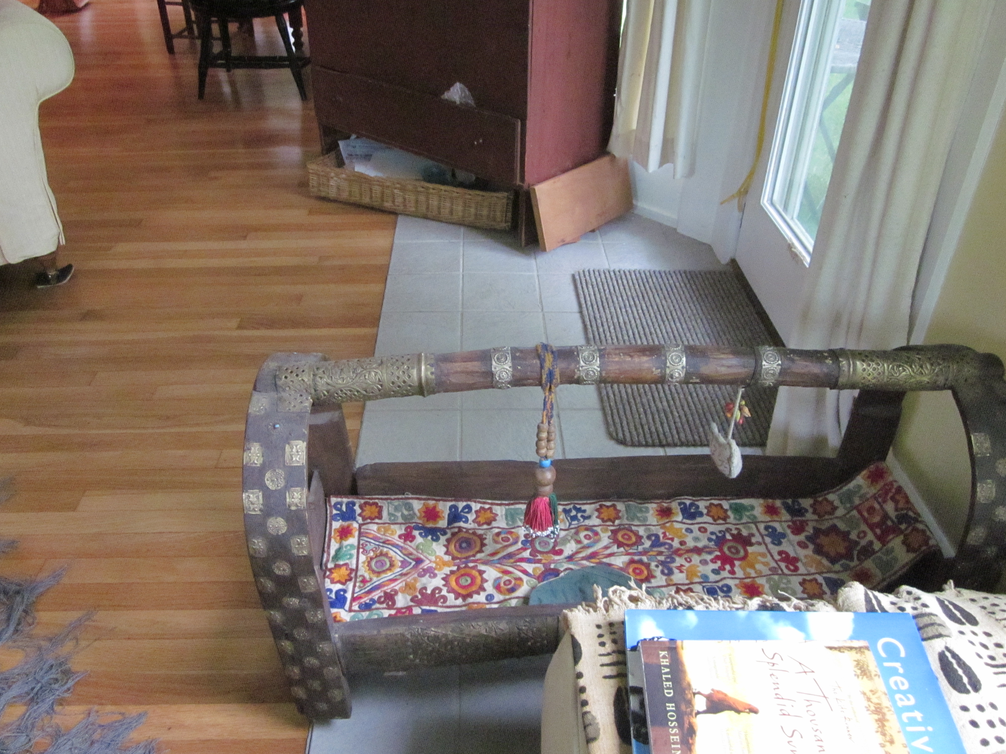 We brought the Afghan baby crib into the living room, plus the embroidered baby caps, hoping that this would speed things up. Sometimes superstition is fun.