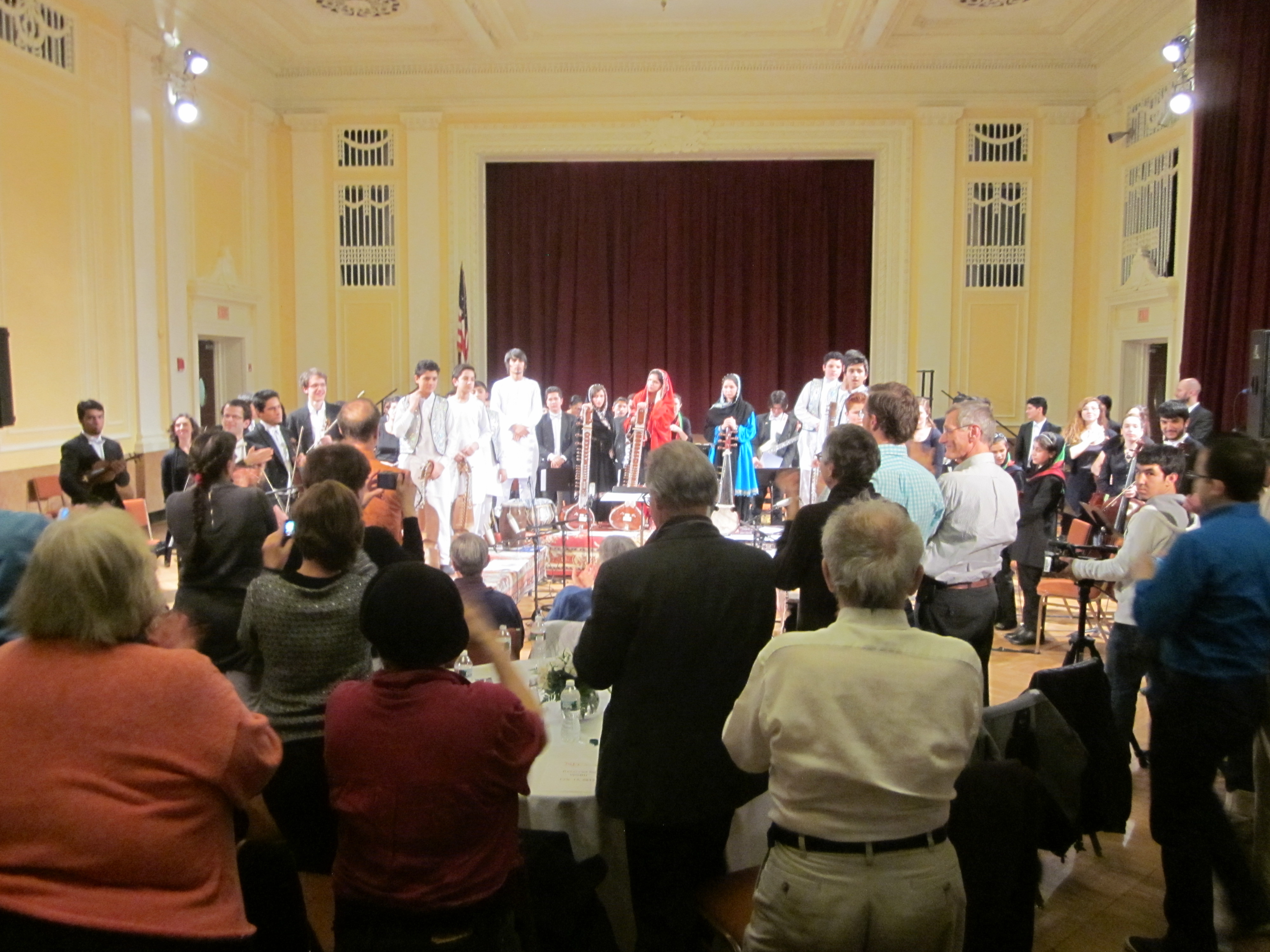 Anyone with a bit of an Afghan connection seemed to be there, in the basement of the New England Conservatory. We sat around tables while the orchestra members sat on chairs or on carpets on a podium in their midst. The American kids were dressed in orchestra black and grey while the Afghan kids were dressed in colorful and/or embroidered tunics and dresses, the girls with scarves in the colors of the Afghan flag (black, red and green).