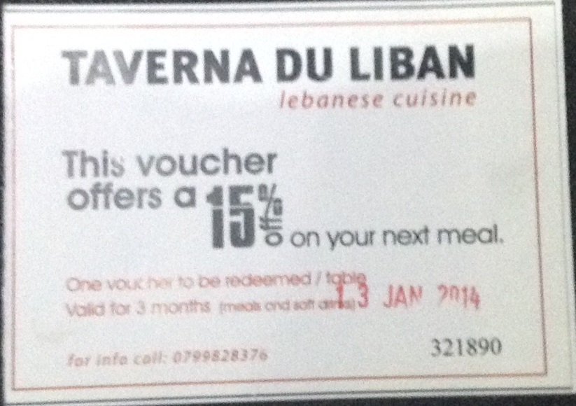 01d6b9f9ae4f2a9c53ffec4cf74615fd44aebe1813I carry with me a card that entitles me to a 15% discount for my next meal at La Taverna. I am holding on to it for reasons I don’t understand, maybe it is gratefulness; gratefulness of having walked out with that card.